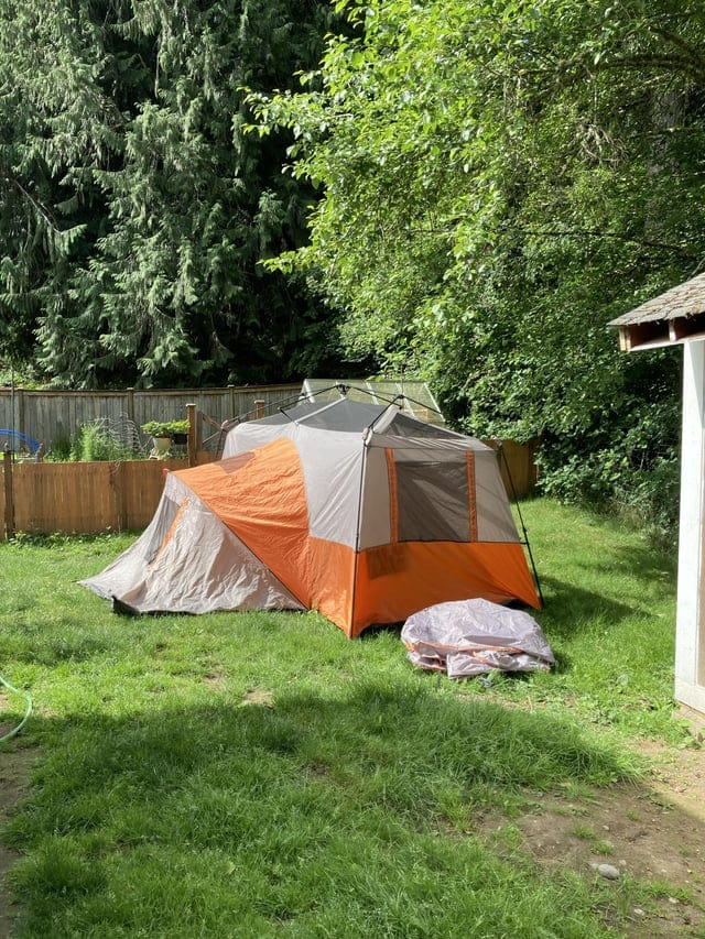 Палатка на одиннадцать человек. Для неё нужна только новая стойка. Все молнии работают, никаких потёртостей или разрывов. Выглядит как новая, стоит около 250 баксов.