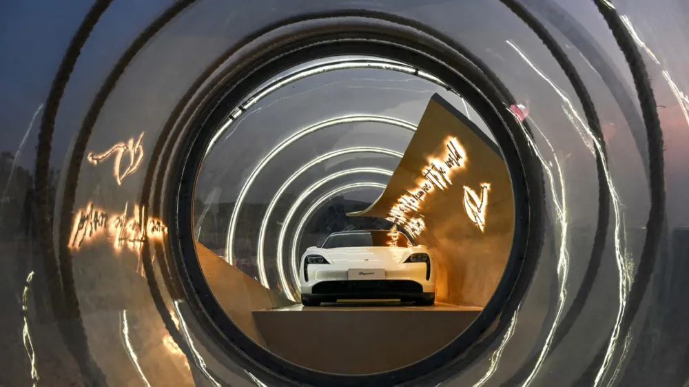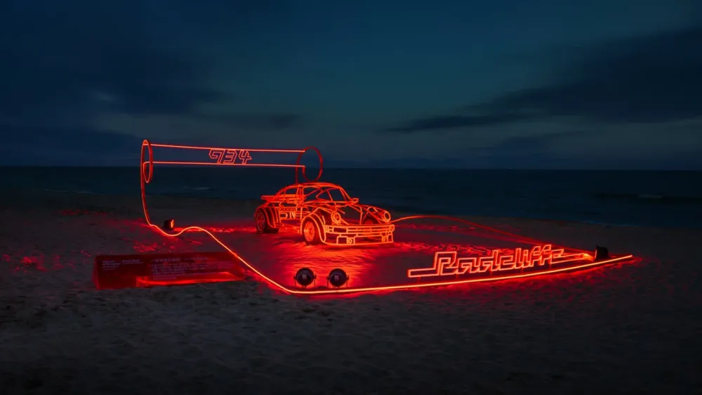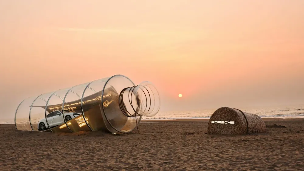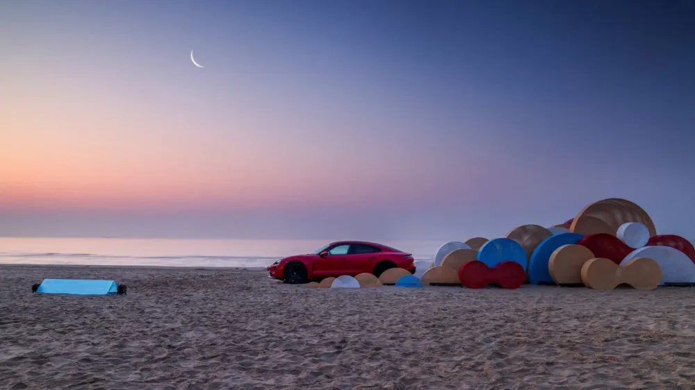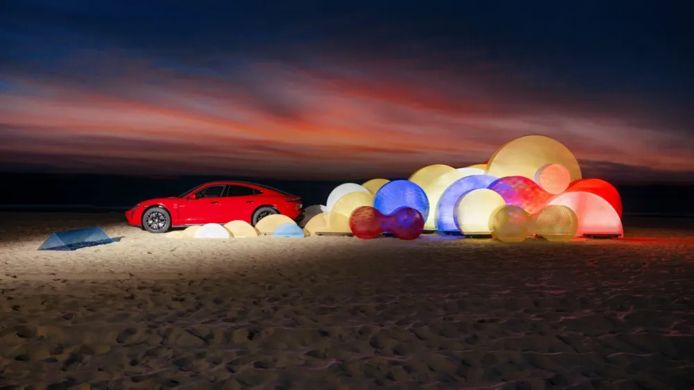 Porsche Taycan стал героем сразу двух арт-объектов. Первый под названием Dream in Motion — визуализация мчащегося по песку электрокара, где клубы пыли за ним изображены с помощью ярких конструкций. Второй — это Taycan, заключённый в огромную стеклянную бутылку и обёрнутый в свиток. Свиток изображает копию одного из чертежей Porsche 356 руки Фердинанда Порше, а арт-объект в целом назван современной интерпретацией мечтаний основателя марки о спортивных автомобилях.