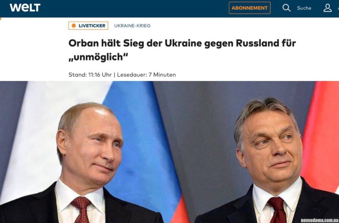 Также он заявил, (https://www.welt.de/politik/ausland/article246082090/Ukraine-News-Orban-haelt-Sieg-der-Ukraine-gegen-Russland-fuer-unmoeglich.html) что достижение мира зависит от США, а не от нее.