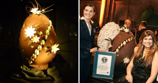 Шоколадное яйцо было сделано из шоколада Amedei и съедобного сусального золота. В начинке десерта содержался шоколад и трюфели. На его изготовление ушло целых три дня. Весило всё это великолепие 50 килограммов.