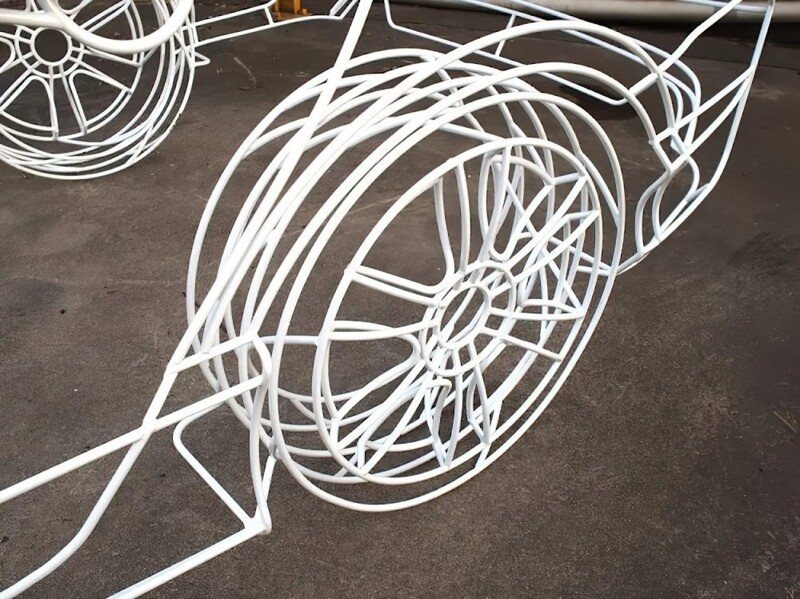 Каркасные автомобили были сначала спроектированы с помощью программного обеспечения 3D CAD (автоматизированное проектирование), затем детали вырезали из металлических листов с помощью прецизионных лазерных резаков. Металлическая проволока была помещена и приварена вокруг этих «выкроек», а затем их убрали, оставив лишь проволочный каркас.