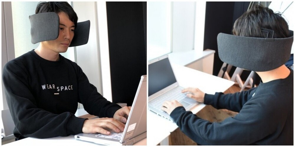 А вот такая штука помогает работать японцам в огромных открытых офисах. Она помогает не отвлекаться на посторонние раздражители и полностью сосредоточится на работе.