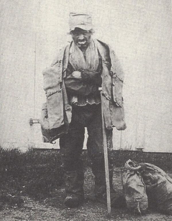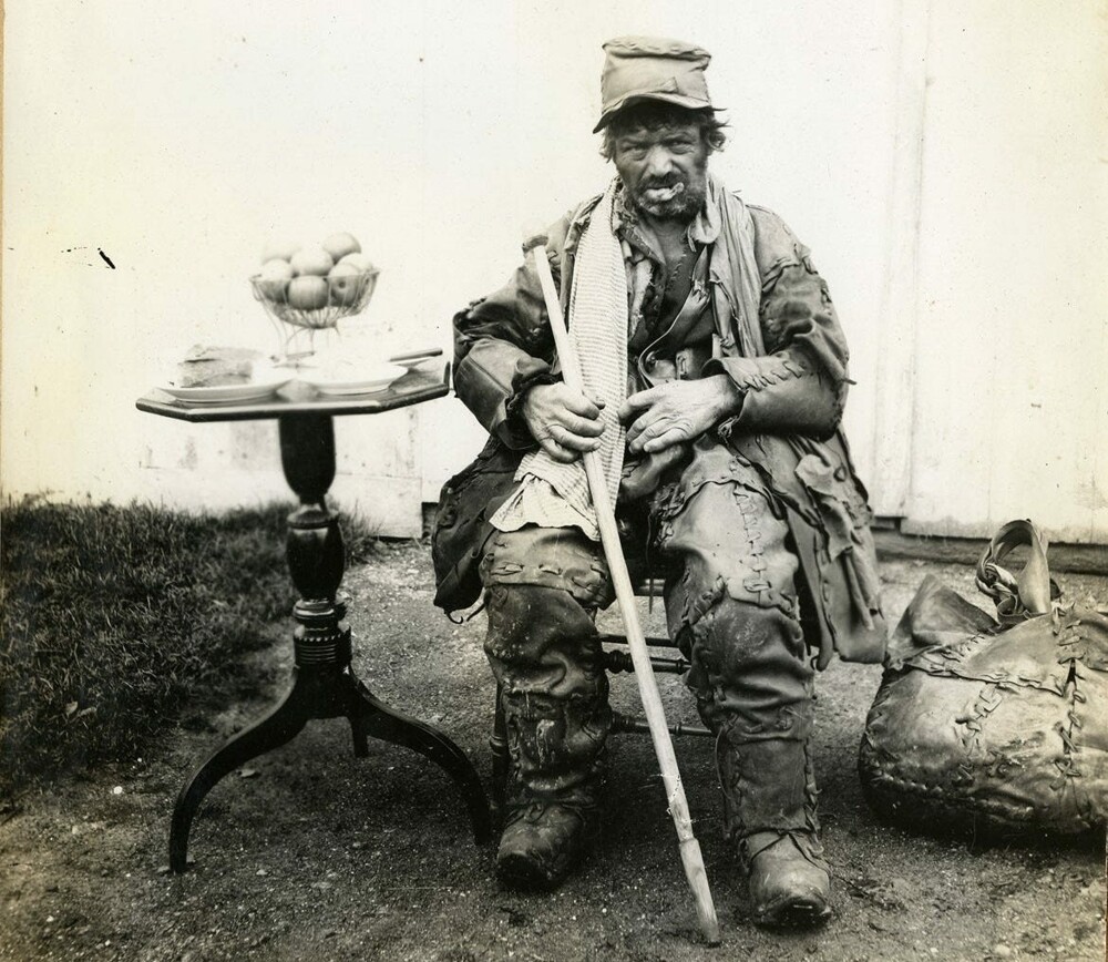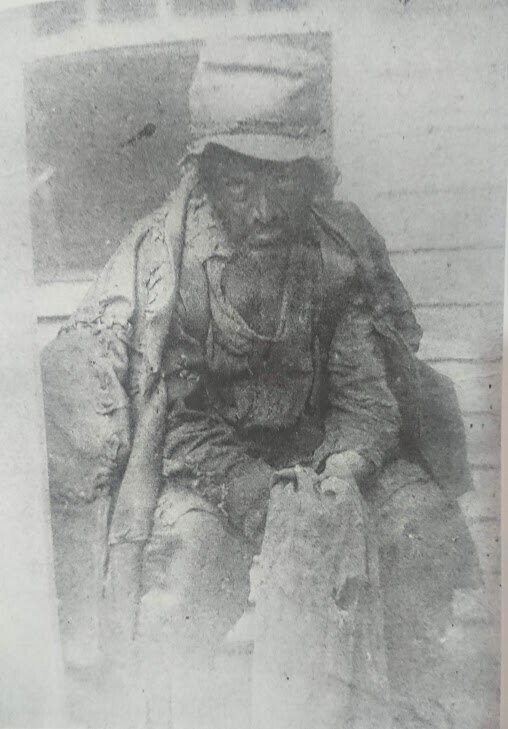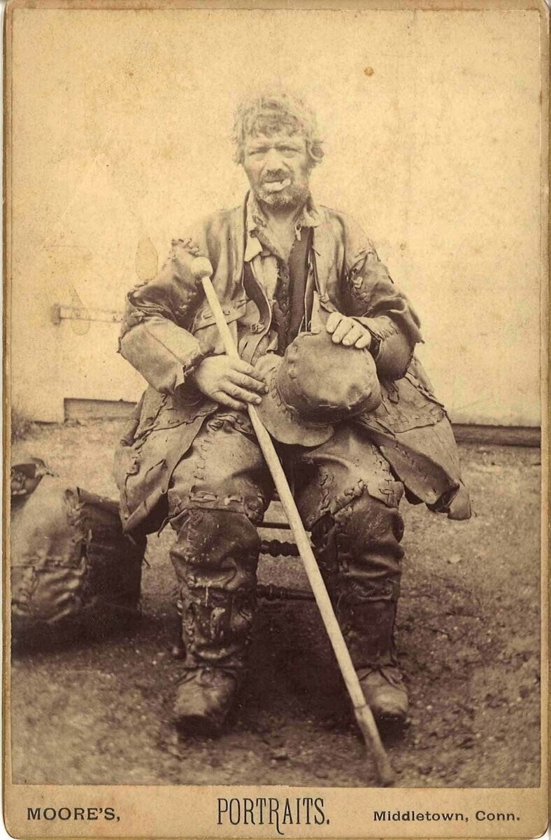Отшельник, которого в народе прозвали «Кожаный человек», привлёк к себе внимание приблизительно в 1857 году, когда бродяжничал по Новому Свету в наряде ручной работы, сшитом из грубой кожи.