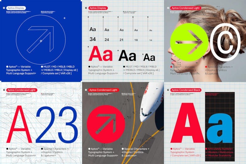 Microsoft сообщила , что впервые с 2007 года сменила шрифт по умолчанию в офисном пакете — вместо Calibri им стал Aptos, гуманистический гротеск, вдохновлённый швейцарской типографикой середины XX века. Первоначально Aptos был известен как Bierstadt, и его среди пяти предложенных кандидатов (помимо Aptos, ими стали Grandview, Seaford, Skeena и Tenorite, которые также будут доступны в рамках пакета) выбрали ещё в 2021 году.