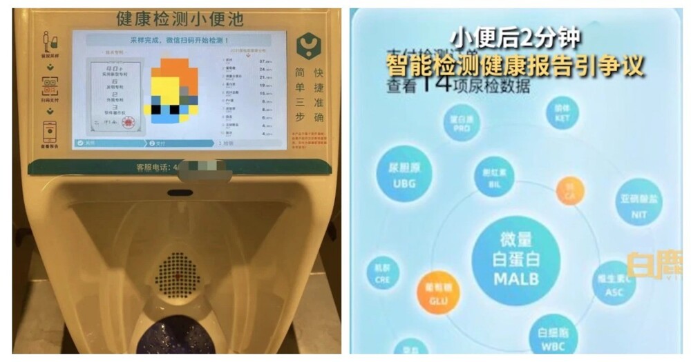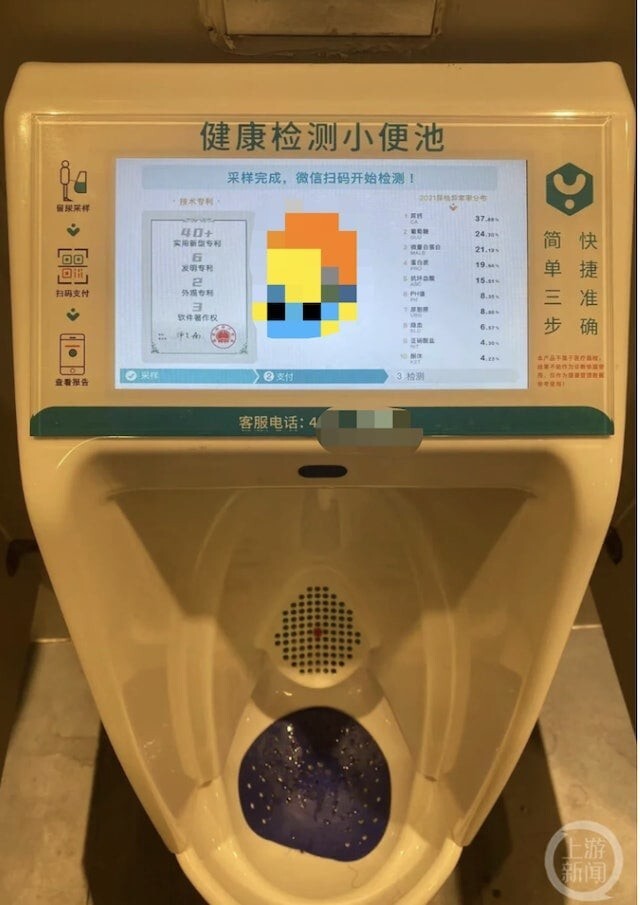 В торговых центрах, парках и других городских объектах Китая появились высокотехнологичные писсуары, позволяющие быстро сдать анализ мочи. Устройство оснащено датчиками, которые анализируют мочу на множество маркеров, включая кальций, глюкозу, белок, кетоновые тела, аскорбат и другие. Судя по информации на экране, разработчик получил несколько патентов.
