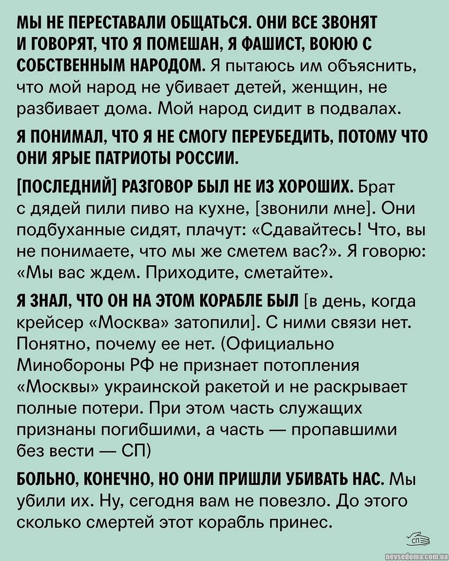 - "Я за Украину. А они против". Украинец защищает свою страну, но его родственники имеют пророссийскую позицию: брат погиб на крейсере "Москва", кум служил в "ДНР"