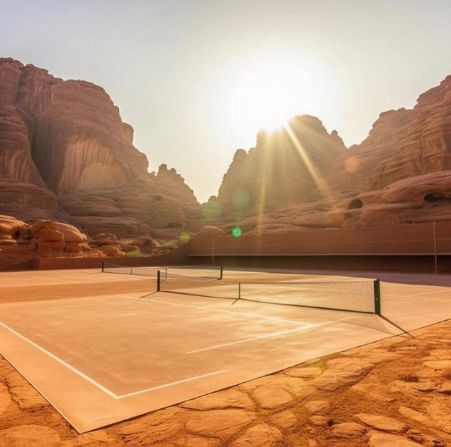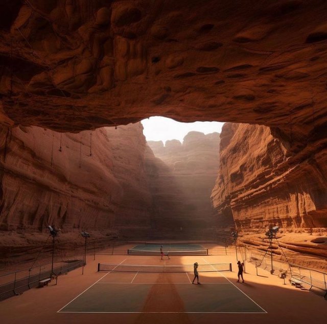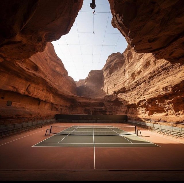 Неожиданный вариант расположения теннисных кортов можно увидеть на этих кадрах. Пока непонятно, настоящее это или же макет, но выглядит весьма интересно. Только непонятно, куда девать зрителей, а также как играть по такой жаре.