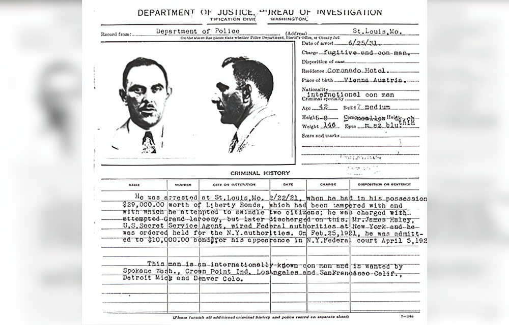 Отчет Министерства юстиции о Викторе Люстиге, в котором он назван «международно известным мошенником», 25 июня 1931 года