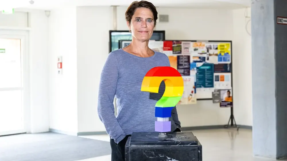 Пресс-секретарь вуза Катрин Фишер рядом со знаком вопроса, который теперь установлен на постаменте.