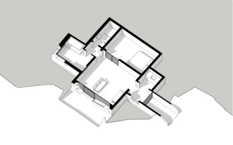 Аскетичный, брутальный дизайн внутреннего интерьера дополняют оставшиеся практически в первоначальном виде бетонные стены. Работая над проемом, авторы проекта попытались воспроизвести пролом, образовавшийся в результате взрыва немецкой авиабомбы, который удивительным образом гармонирует с просторными раздвижными окнами.
