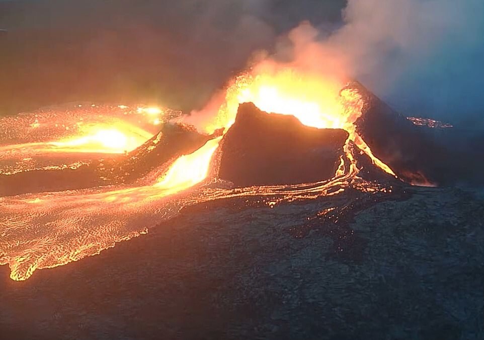 На полуострове Рейкьянес начал извергаться самый молодой вулкан Исландии. Сейчас он выбрасывает лавовые "снаряды" с такой силой, что уже рухнули северная и восточная стенки кратера.