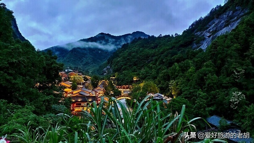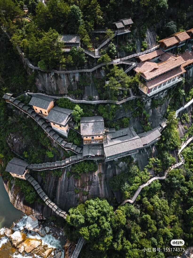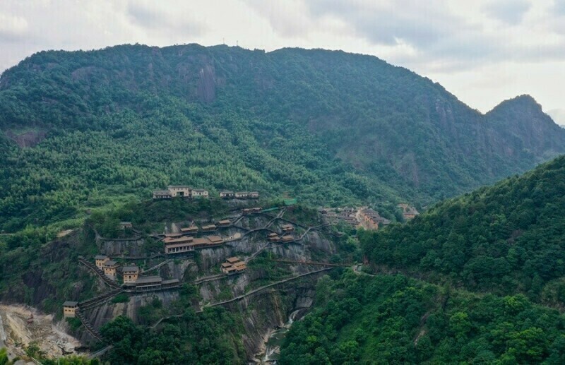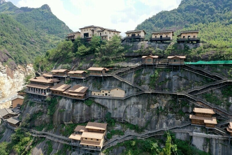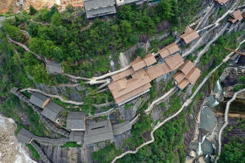 Здесь отстроили домики в традиционной китайской технике, которые укрылись в сочной зелени гор