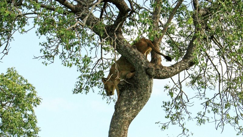 В национальном парке Крюгере в ЮАР туристка запечатлела львицу, прятавшуюся на дереве от семи самцов. Львы хотели продолжения рода, но в планы сильной и независимой самки близость в этот день не входила.