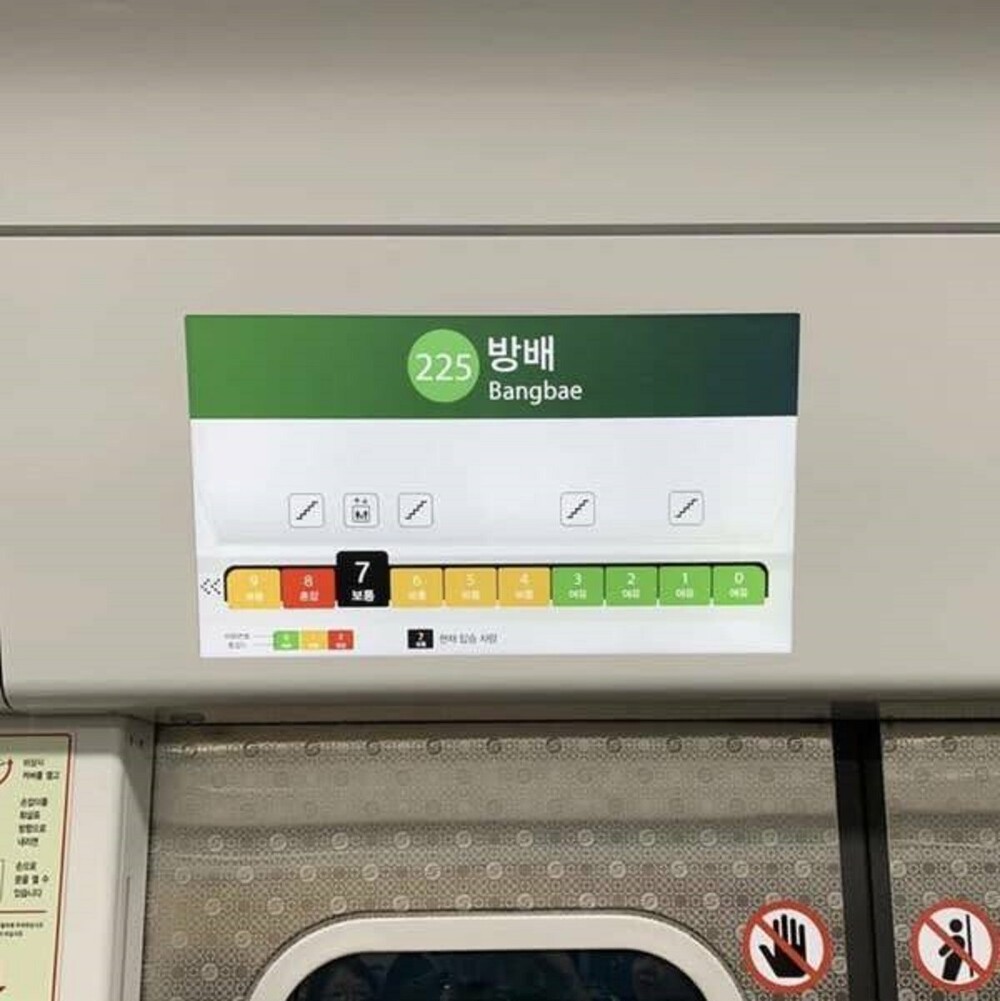 4. В метро Сеула, Южная Корея, показано, насколько заполнен каждый вагон