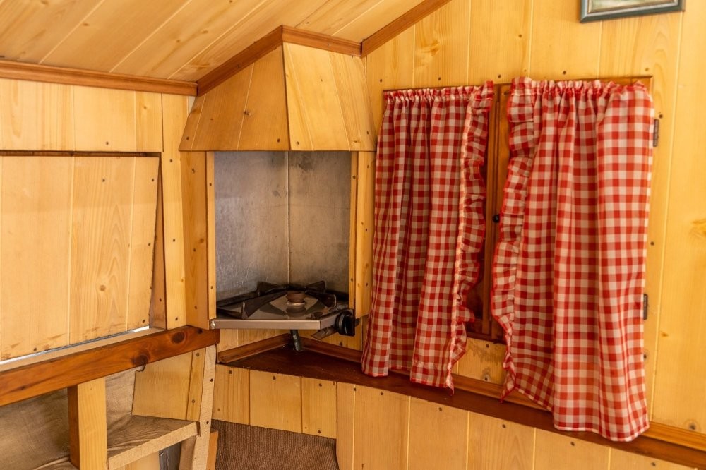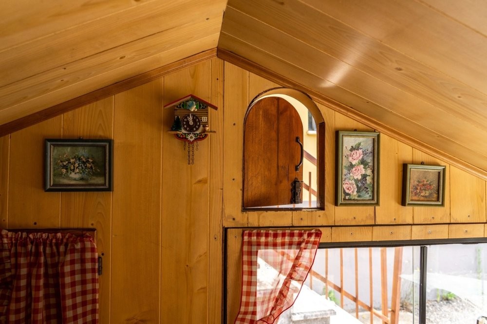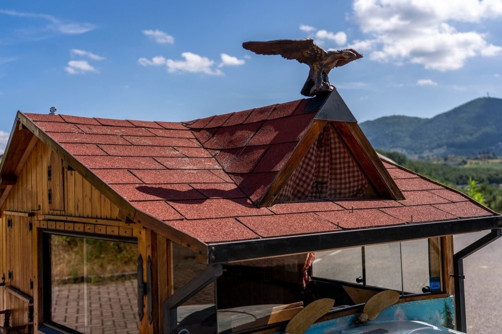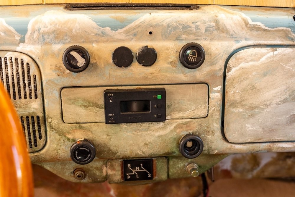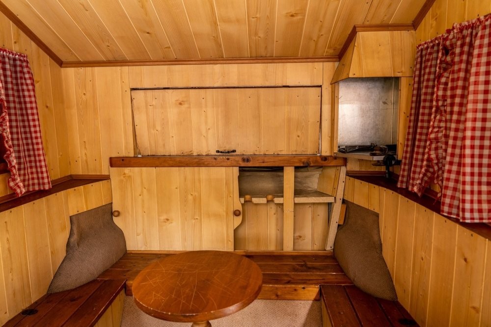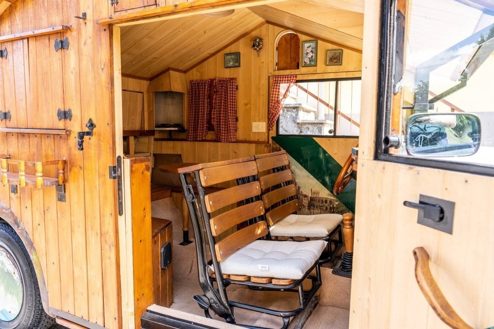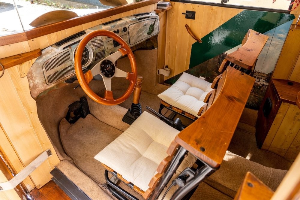 Автомобиль представляет из себя традиционное шале, в котором есть диван, обеденный стол, мини-кухня с газовой плиткой. На стенах можно увидеть картины и часы с кукушкой. Передние сиденья водителя и пассажира выполнены в виде деревянных стульев. Руль и рычаг КПП сделаны из дерева. Причем вместо рычага коробки передач используется перевёрнутая ножка стола.