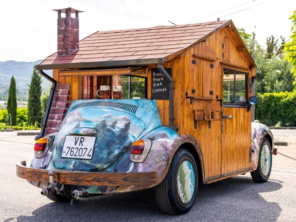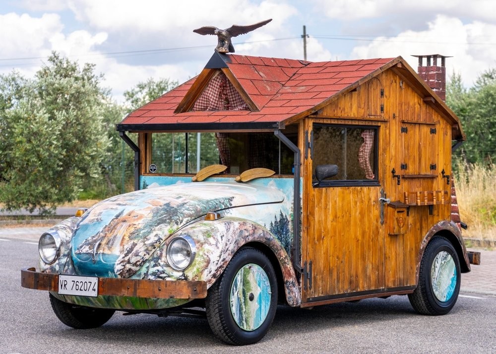 В Италии выставили на аукцион VW Beetle 1970 года переделанный деревянную избушку-пивбар. Продавец просит за уникальный автомобиль Holzhaus от 20-30 тысяч евро.