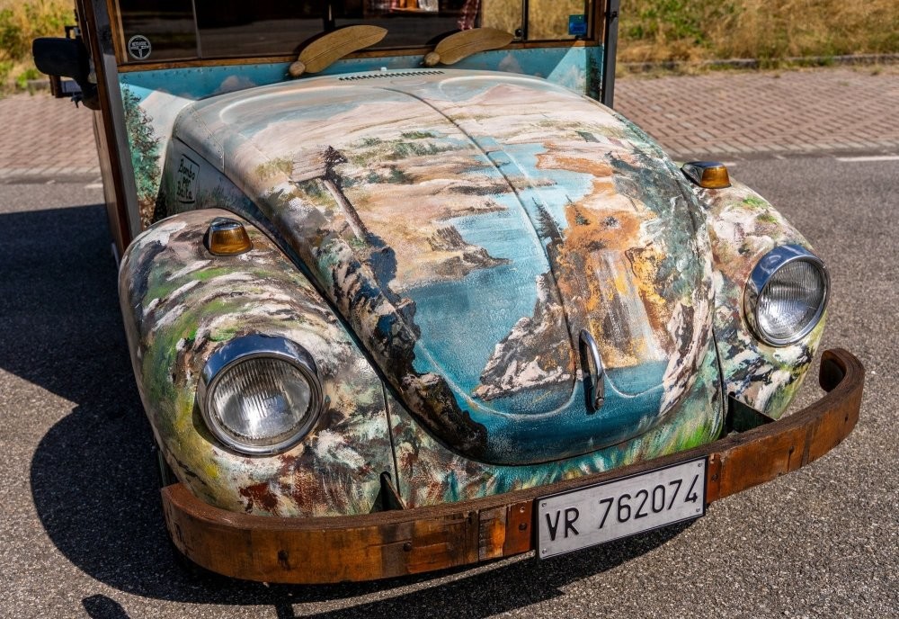 Кузовные панели — металлические, а бамперы окрашены под дерево. На кузове повсюду — изображения альпийских пейзажей.