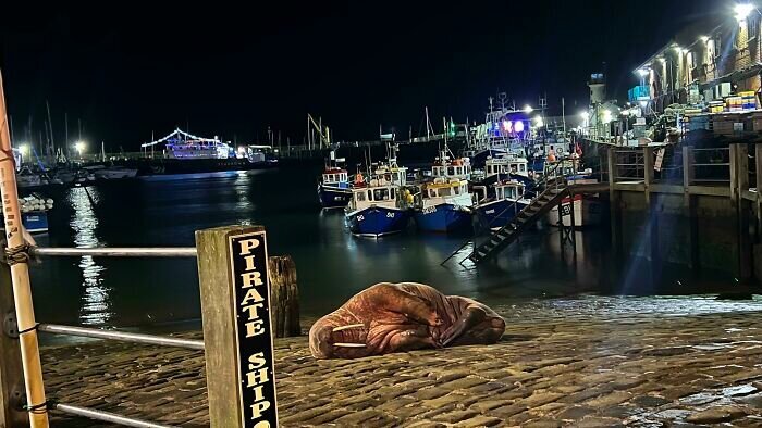 «Прошлой ночью случайно увидел моржа в гавани Скарборо, когда он решил вздремнуть»