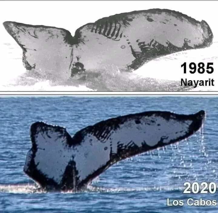 6. Один и тот же кит с разницей в 35 лет! Оба снимка сделаны у берегов Мексики. Последний снимок датируется 2020 годом, а первый - 1985 годом.