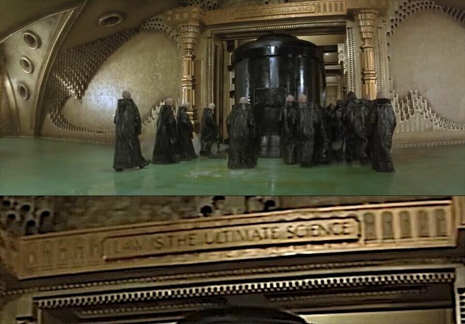 12. В конце первой встречи Гильдии и Императора над порталом можно прочитать фразу «Law is the ultimate science». Я так и не смог найти вразумительного объяснения, что Герберт хотел этим сказать. А вы как думаете?