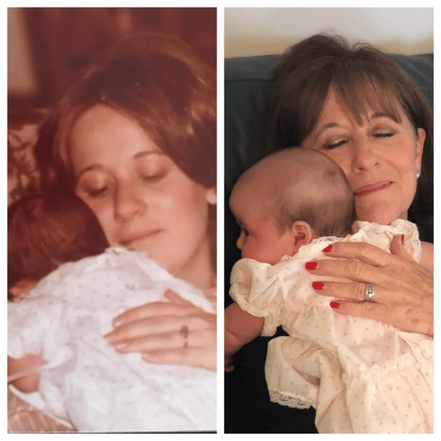 Моя мама держит меня в 1979 году и моя мама держит мою дочь в том же платье в 2019 году
