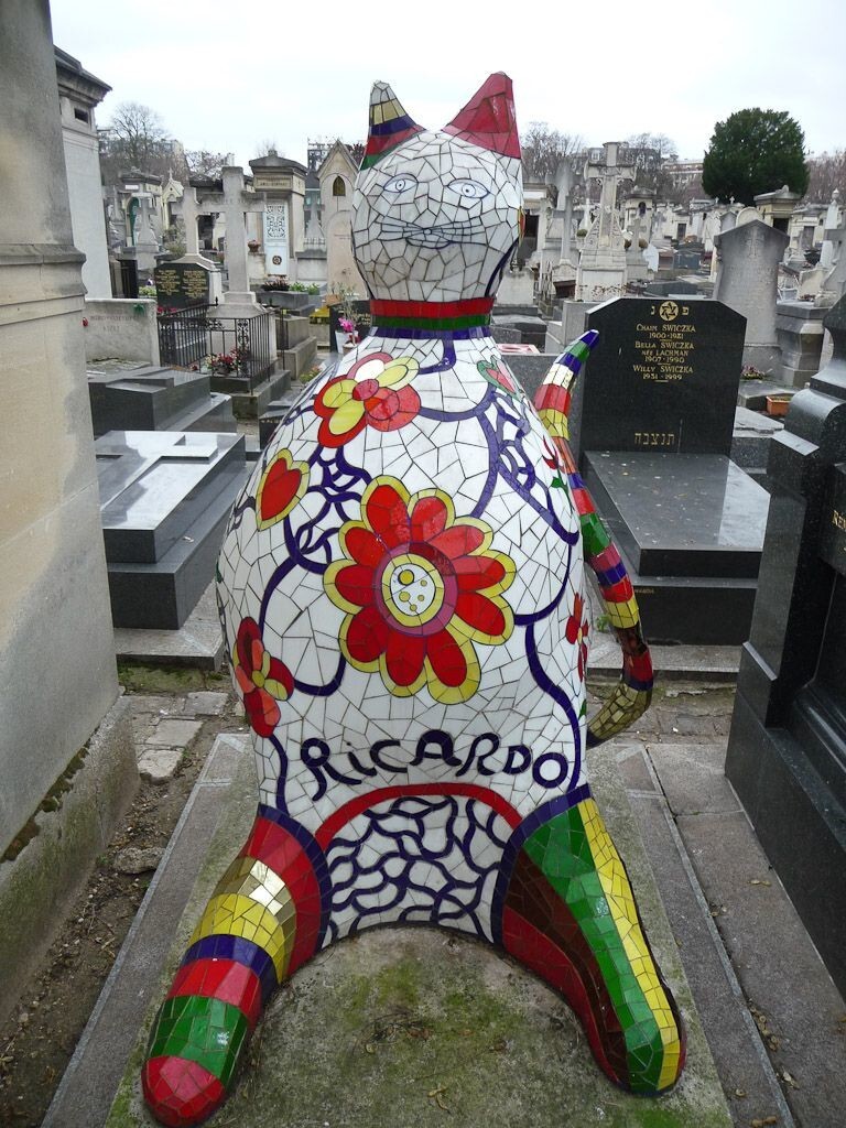 Среди викторианских могил и гранитных надгробий парижского кладбища Монпарнас можно обнаружить одно красочное творения. "Кот Рикардо" имеет высоту около 1,5 м и украшено мозаикой. Художница Ники де Сен-Фалль создала этонадгробие для своего помощника Рикардо Менона, умершего в 1989 году в возрасте 37 лет. Эпитафия у лап кота гласит: "Нашему другу Рикардо, который умер слишком рано, красивому, молодому и любимому".