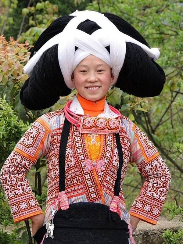 Длиннорогие мяо — это один из народов Китая. Его традиционный головной убор состоит из рога, шерстяных волос и нитей. Изготовляется этот элемент одежды путём накручивания выпавших волос нескольких поколений девушек племени на рог животного. Полученная конструкция фиксируется нитками. По весу может достигать 6 кг.