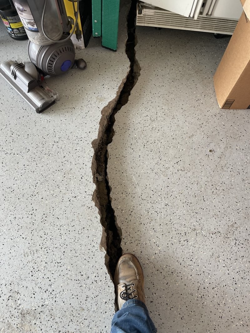 7. Гараж испещрен трещинами. Видно, что плита проседает