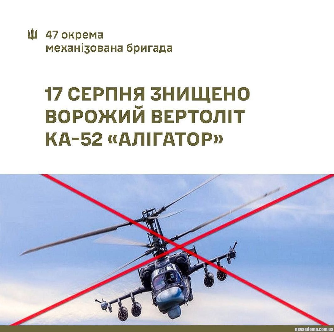 - Утром, 17 августа в Запорожской области сбили два российских вертолета Ка-52