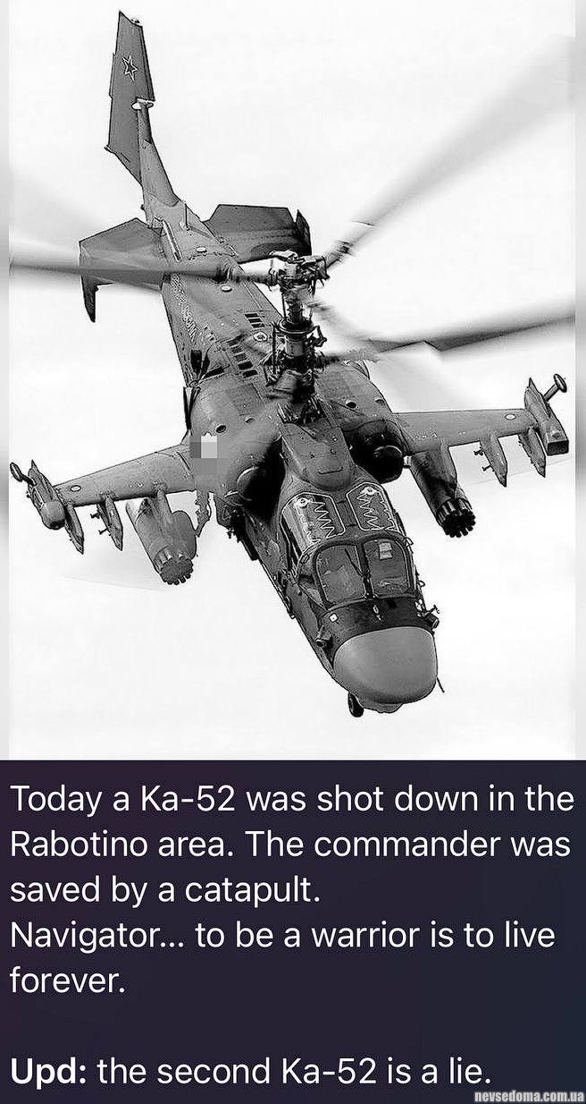 - Российский военный источник подтверждает, что российский ударный вертолет Ка-52 «Аллигатор» был сбит 17 августа в районе Роботино Запорожской области.