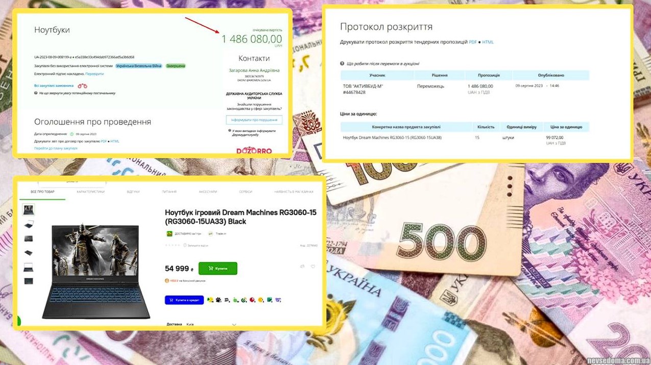 И это при том, что в магазинах такой же ноут стоит в среднем 55 000 грн. Итог: потрачено (https://prozorro.gov.ua/tender/UA-2023-08-09-008199-a) на ноуты 1 486 000 грн, при том, что по реальной цене их можно было купить всего за 825 тысяч (в интернет-магазинах такой стоит всего 55 тыс).