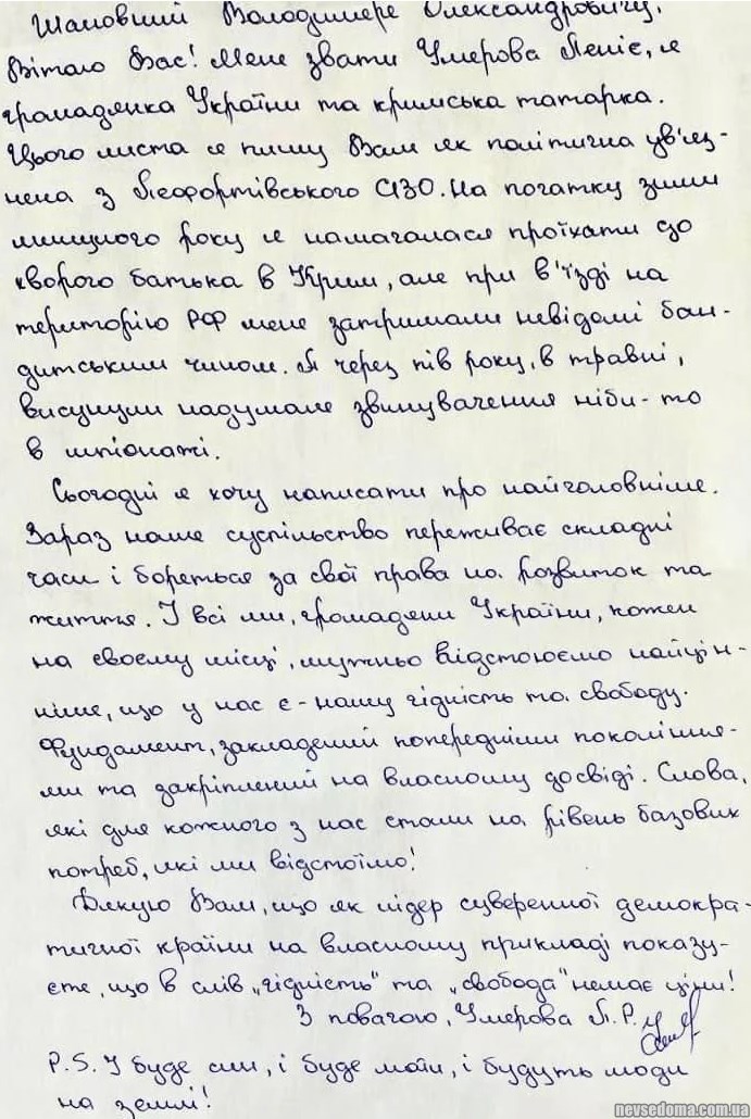 25-летняя крымская татарка и гражданка Украины Ление Умерова, которую ранее задержали в России при попытке навестить больного раком отца в Крыму, написала письмо Владимиру Зеленскому.