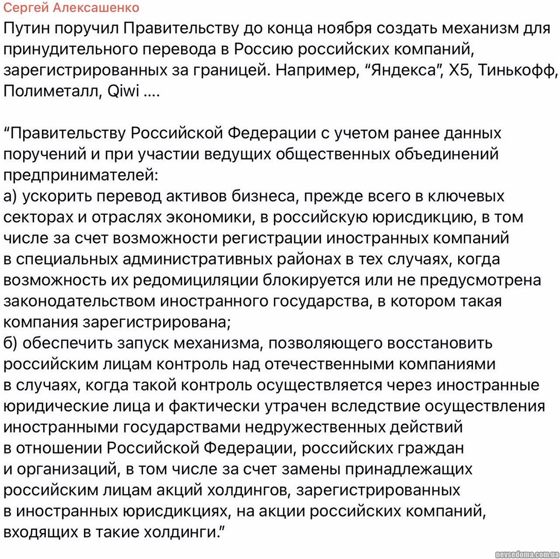 - Путин поручил Правительству до конца ноября создать механизм для принудительного перевода в Россию российских компаний, зарегистрированных за границей. Например, “Яндекса”, Х5, Тинькофф, Полиметалл, Qiwi …