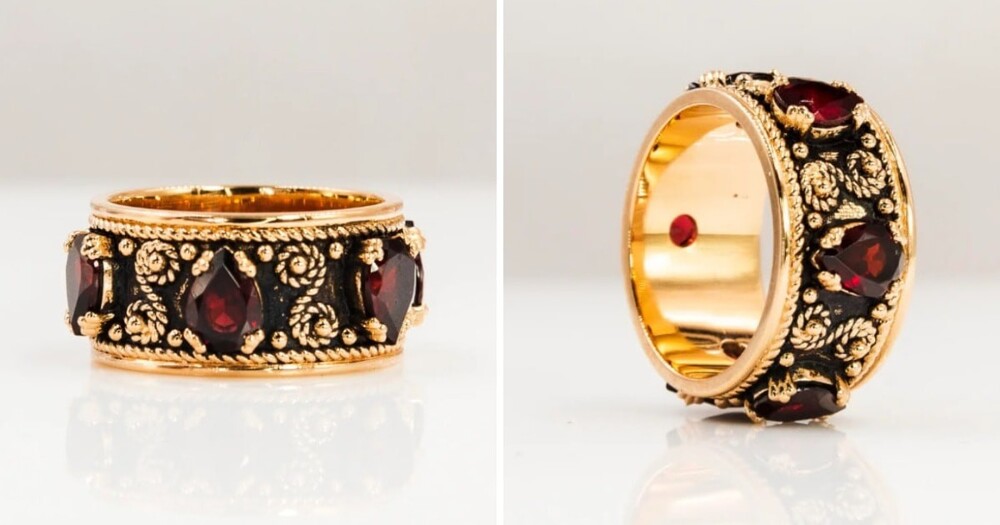 Кольцо, которое я недавно закончил, украшено гранатом и розовыми сапфирами