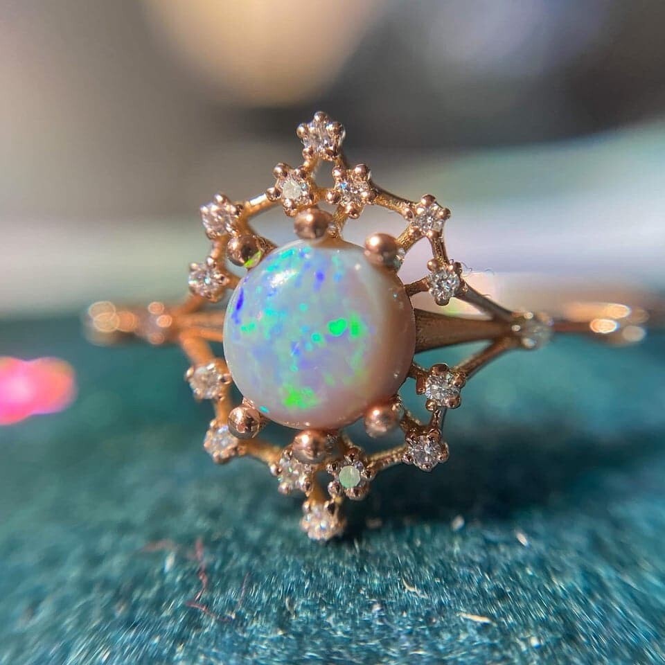 Законченное кольцо из розового золота с австралийским опалом и бриллиантами
