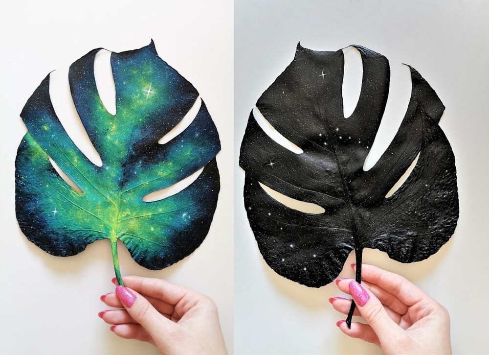 17. Я сняла увядающий лист со своего комнатного растения и нарисовала на нем несколько звездных пейзажей