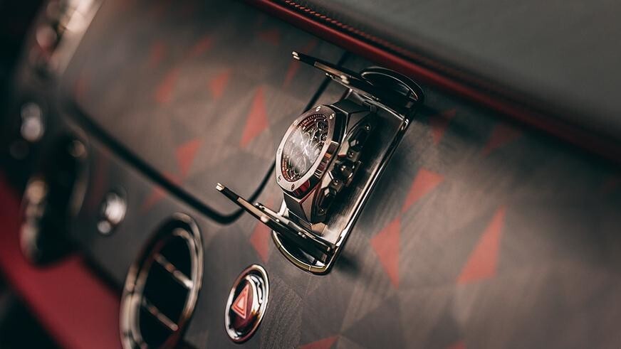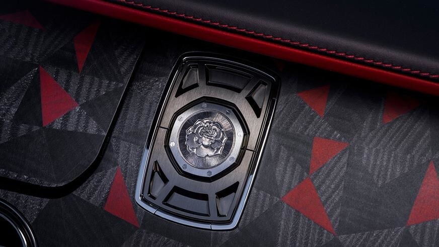 Уникальный хронометр бренда Audemars Piguet был оговорён ещё на стадии формирования заказа. Часы Royal Oak Concept Split-Seconds Chronograph GMT Large Date с автоматическим подзаводом удерживаются на приборной панели фиксатором с электроприводом. Когда же они находятся на руке хозяйки, ниша на приборной панели заполняется монетой с ручной гравировкой в виде розы.