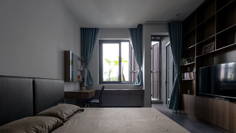 Фасады из складных тиковых панелей обеспечивают возможность регулировать вентиляцию и защиту от солнца. Они не только защищают от прямых солнечных лучей, но и предотвращают потерю обзора благодаря своей полупрозрачной структуре. Использование латеритного камня в фасаде — популярного материала в тропических странах, включая Вьетнам — также способствует поддержанию комфортной температуры в помещении. Все эти материалы также служат эстетической цели, придают фасаду загородный стиль.