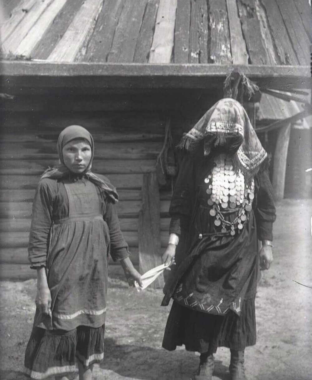 6. Сестра жениха ведет невесту за платок на речку для обливания водой согласно свадебному обряду, Удмуртия, 1930 год