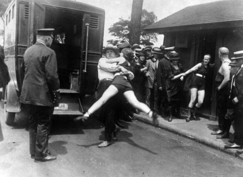 1. Полицейские задерживают женщин, которые надели купальники с открытыми ногами, Чикаго, 1922 год