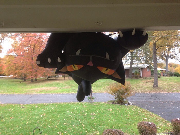 9. «На Хэллоуин у меня на крыше дома был надувной кот. Вчера вечером было очень ветрено. Вот что встретило меня, когда я открыл дверь сегодня утром. Чуть кони не двинул!»