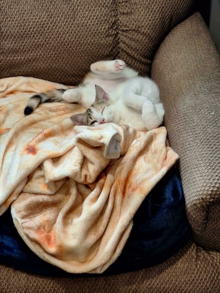 25. Приютский котёнок, которого перевезли в новый дом, спит в окружении игрушек