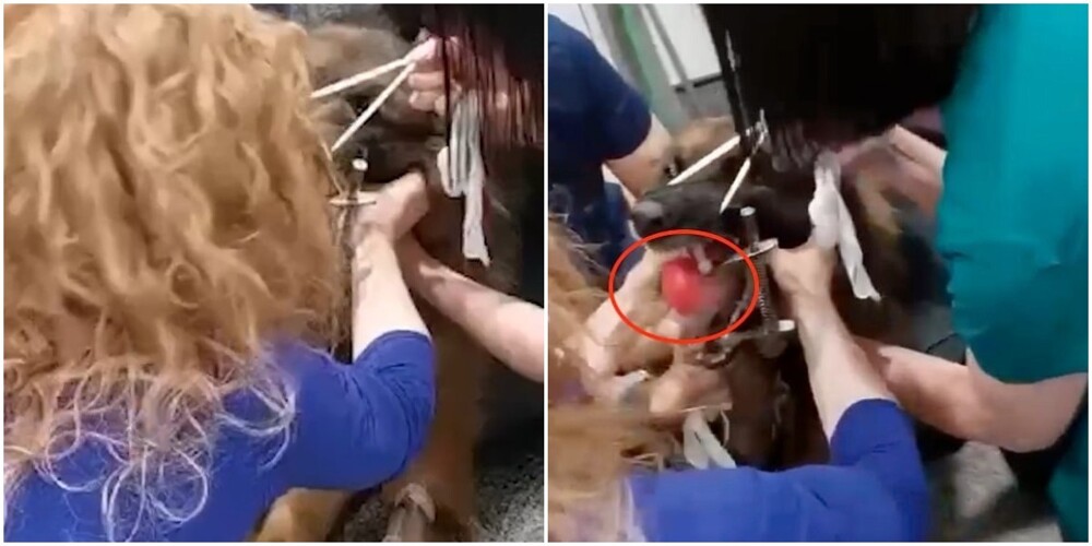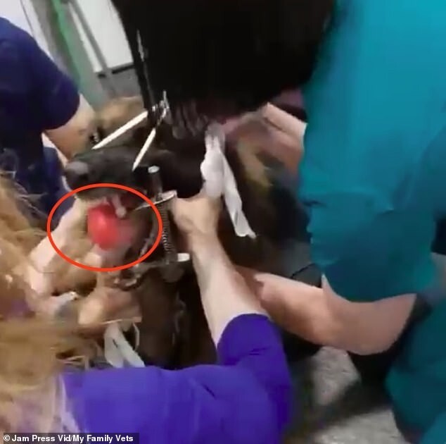 На морду Кайзера поместили специальный кляп, и к счастью, мячик достаточно быстро вытащили. Для этого ветеринар нащупала мяч руками снаружи, и "вытолкнула" его из горла собаки. Вся команда вздохнула с облегчением по завершении операции. Ветеринары, тем временем, предупреждают владельцев собак о потенциально смертельной опасности, которую могут представлять мячи. Подбирайте мяч такого размера, чтобы собака не смогла его проглотить, и наблюдайте за тем, как ваша собака играет с мячом. Если мяч все-таки застрял в горле, то не пытайтесь его вытащить - а сразу покажите собаку ветеринару.