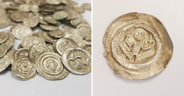 Прогулка с собакой обернулась грандиозной находкой. В глиняном горшке обнаружили самый большой клад за последние 100 лет в Польше (на 2023 год). Пёс по кличке Кайтус раскопал средневековые брактеаты первой половины XIII века с разнообразными изображениями на тонком металле: грифоны, русалки и ангелы, а также архитектурные сооружения.