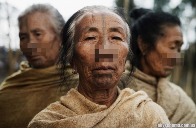 Народ Апатани живёт на Северо-Востоке Индии. Пробки в носу этих женщин — мера защиты от нападений со стороны мужского населения соседних племён, т.е. намеренное обезображивание.