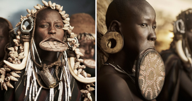 Мурси — этническая группа Эфиопии недалеко от Южного Судана. Тарелки в губах женщин — аксессуар, смысл которого точно не ясен исследователям. Но существует три версии: защита от колонизаторов, показатель социального статуса и показатель выкупа, который отдал за эту женщину муж.