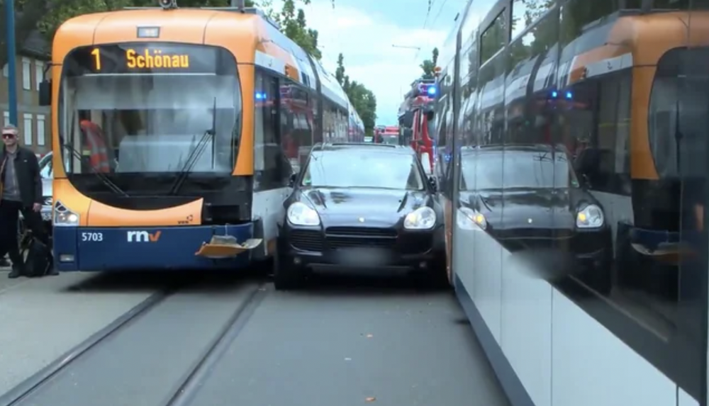 2. "Порше" пытался обогнать трамвай, но застрял между двумя