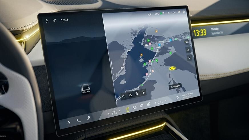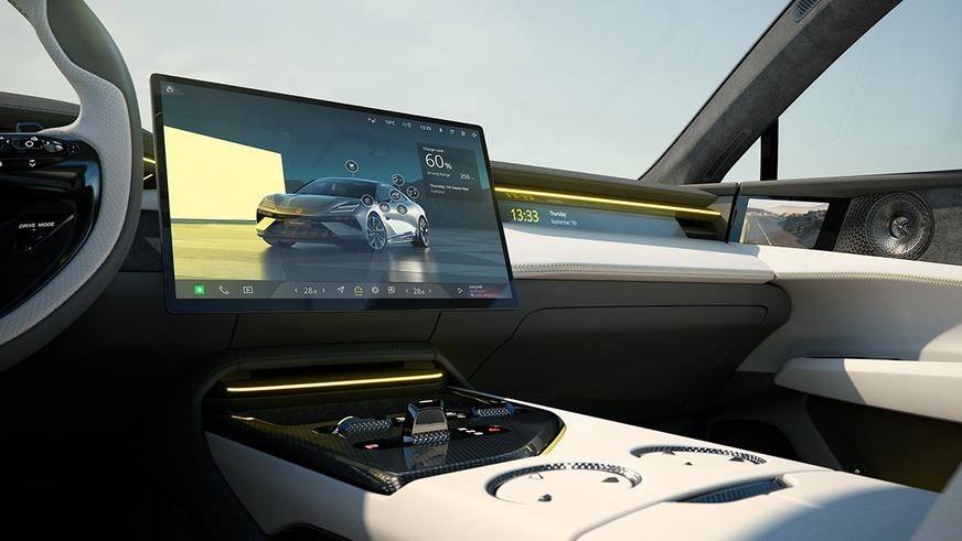 Минималистичный интерьер отличается «слоёной» передней панелью с компактными приборами и дисплеем для переднего пассажира, а также большим центральным тачскрином. Имеется и проекционный экран с визуальной диагональю 55 дюймов, и премиальная акустика с активным шумоподавлением. Lotus пока не вдавалась в подробности оборудования интерьера, упомянув лишь, что для Emeya разработаны новые экологичные материалы отделки. В их изготовлении используется не только пластиковый мусор, но и, к примеру, хлопковые отходы, которые остаются после производства одежды.