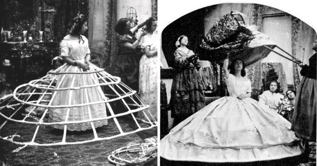 В первой половине 19 века в моду вошли широкие кринолиновые юбки. Эти странные изделия представляли собой каркас из обручей, которые были сделаны из льна и китового уса. Наверное, даже не стоит говорить о том, насколько эти предметы одежды были неудобными — из-за них нельзя было нормально ходить и сидеть.
