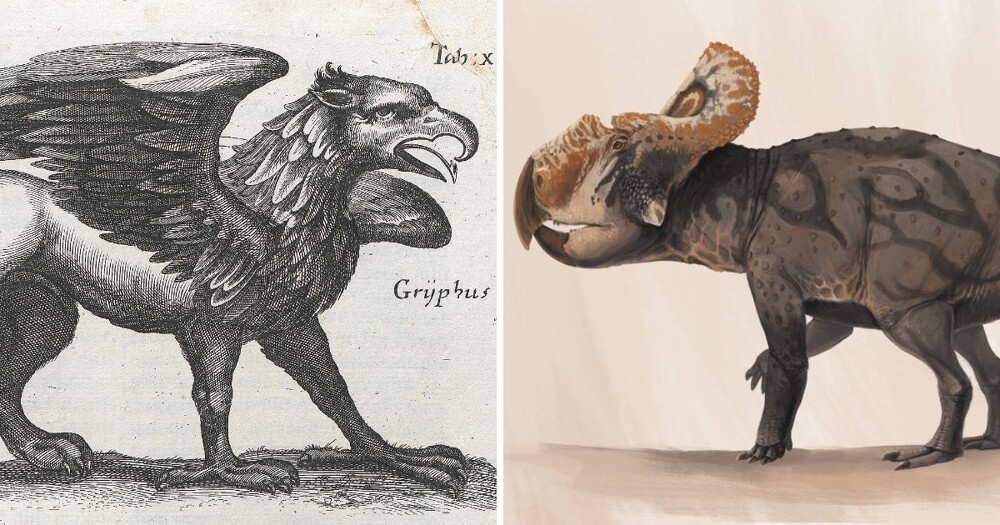 Грифон — это крылатое создание с головой орла и телом льва, которое встречается в различных мифах и сказках. Фольклористы уже неоднократно озвучивали теорию появления этого монстра в сознании людей. Вероятно, он возник после того, как они начали регулярно обнаруживать окаменелые скелеты протоцератопсов. Это достаточно крупные динозавры с острыми клювами и роговыми воротниками.